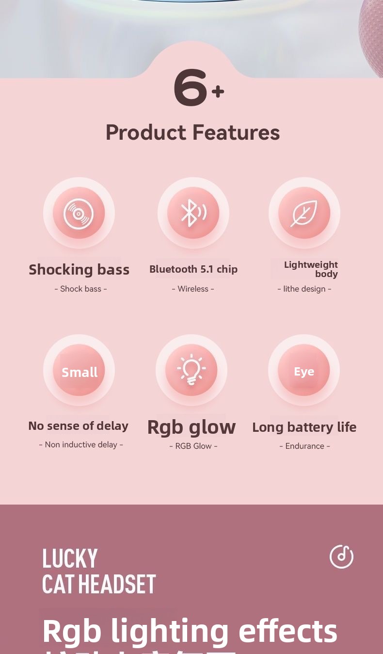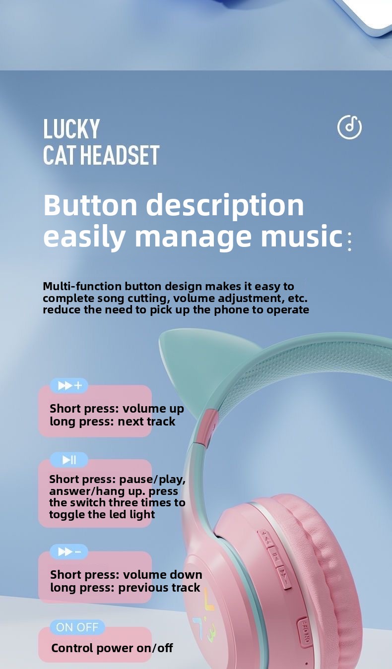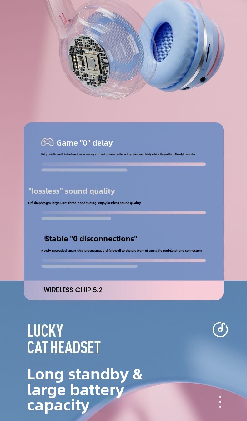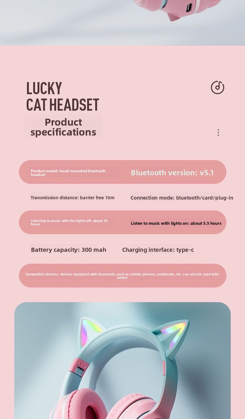 Experience gaming like never before with this Bluetooth Gaming Headset, where cutting-edge tech meets eye-catching style. Featuring mesmerizing gradient cat ears with dynamic lighting effects, this headset turns heads while delivering serious performance. Bluetooth 5.3 keeps your connection rock-solid with minimal power drain, while esports-grade low latency ensures every sound hits exactly when it should. Rock up to 8 hours of non-stop gameplay, music, and calls on a single charge. Built tough with life-waterproof construction and bilateral stereo sound that immerses you completely. Available in five stunning gradient colorways—blue, pink, purple, green, and black—because gaming gear should be as unique as your playstyle.